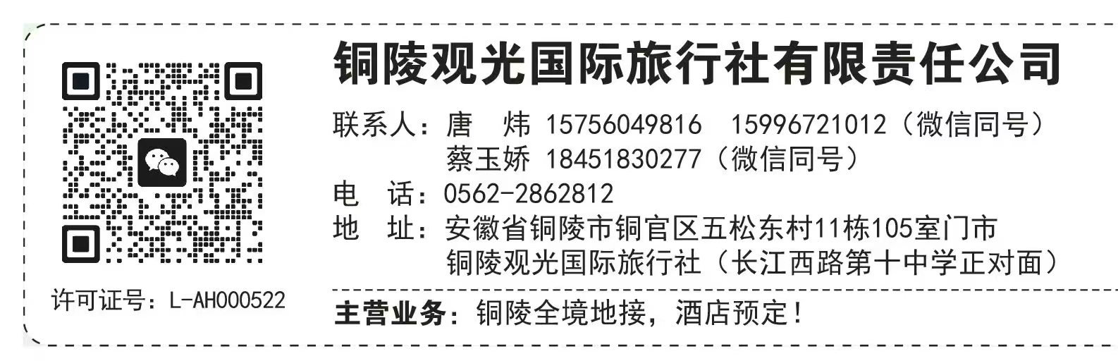 Copyright 安徽銅陵市觀光旅行社有限責任公司 地址: 安徽省銅陵市長江西路第十中學正對面銅陵觀光國際旅行社(五松東村11棟105)